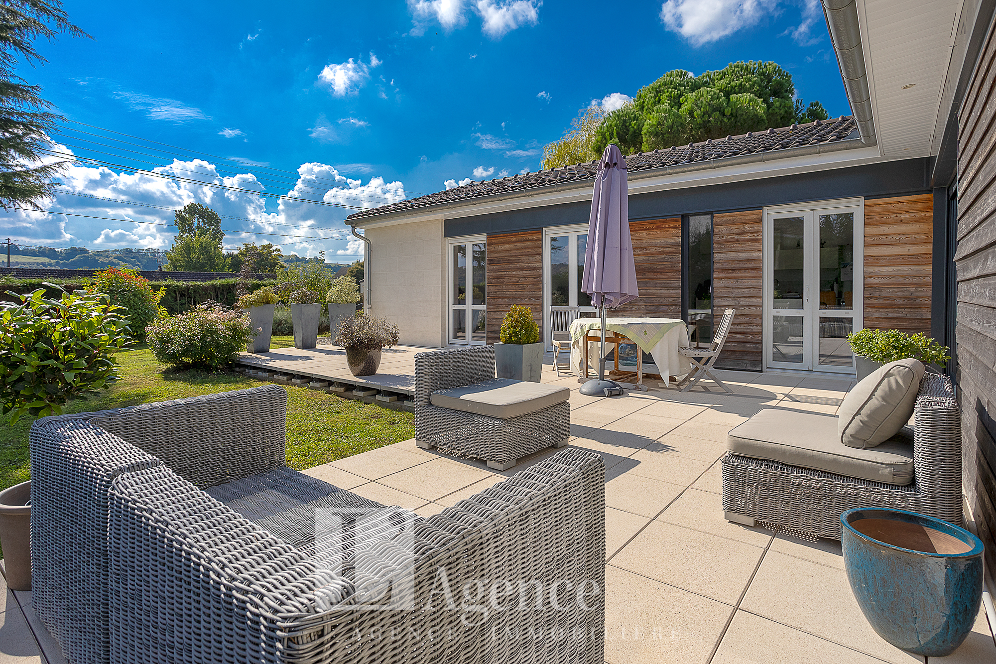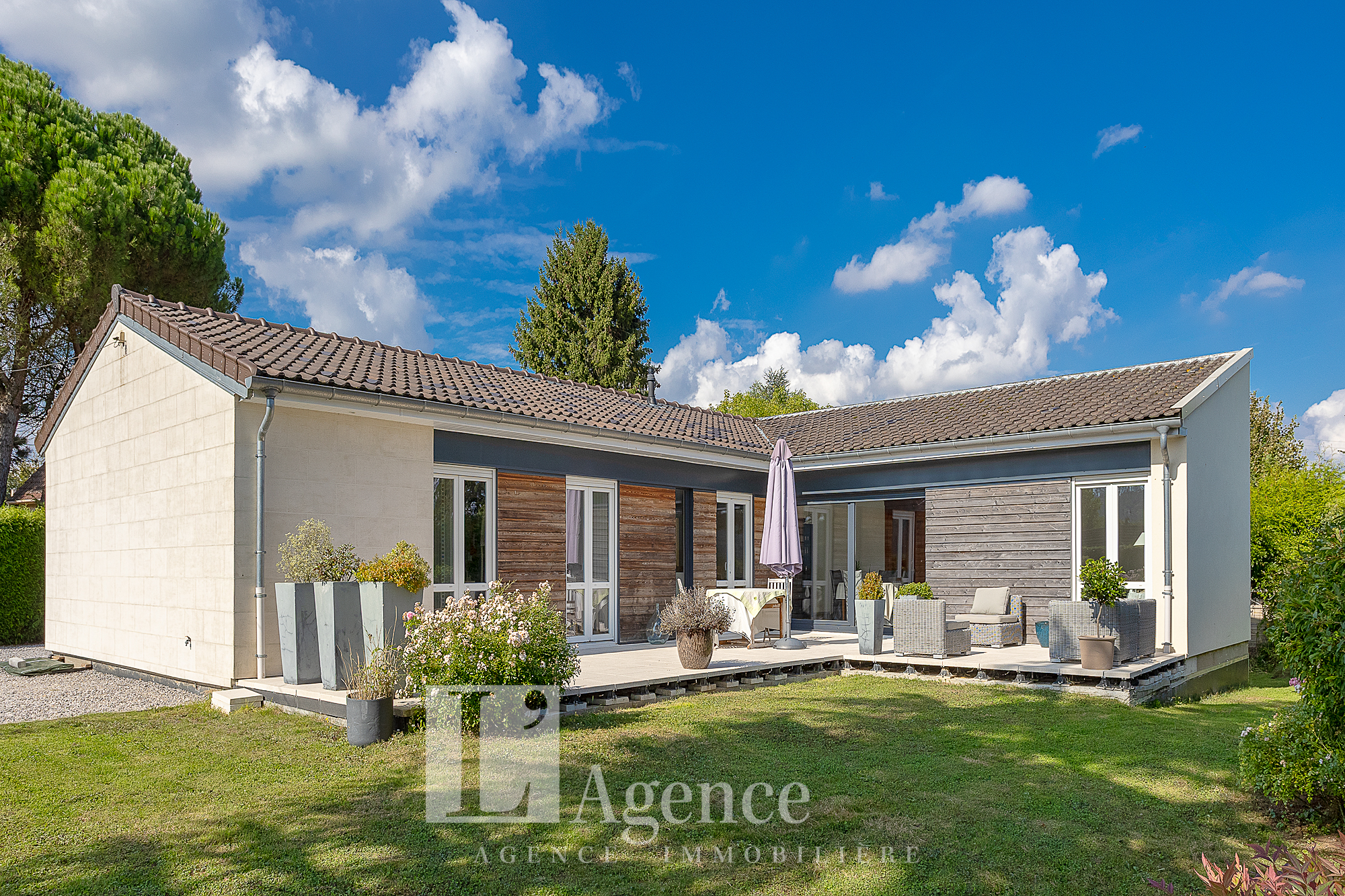 Pavillon de plain pied de type 5 offrant un hall d’entrée distribuant une salle à manger-salon, une cuisine aménage, WC, salle d’eau et 3 chambres (dont une avec dressing). Un sous-sol total avec 4 pièces. Terrasse. Terrain clos de 966 M2.